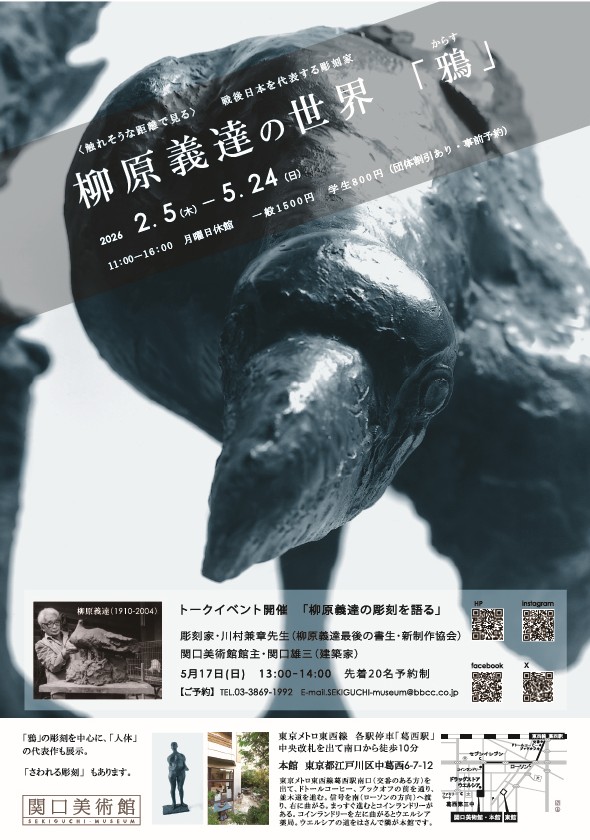 関口美術館の本館はリニューアルし、柳原義達の代表的な「鳩」「人体」「鴉」をテーマに、1年に3つの展覧会を開催しております。
